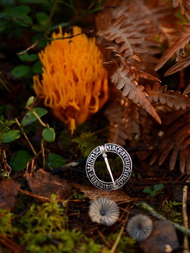 Diese schöne Replik einer runden Fürspange mit Schriftzug stammt von einem englischen Vorbild aus dem hohen Mittelalter.