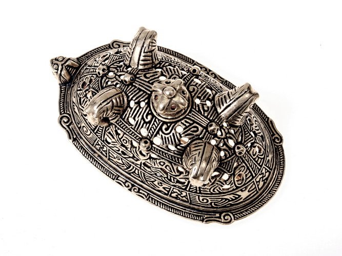 Die Buckelfibel wird auch als Ovalfibel, Schildkrötenfibel oder Schalenfibel bezeichnet und war in der Zeit der Wikinger ein traditioneller Bestandteil der Frauentracht. Dieser spezielle Wikingerschmuck diente dazu, unterhalb der rechten und linken Schulter im Paar getragen, die Schürze mit dem Kleid zu verbinden.