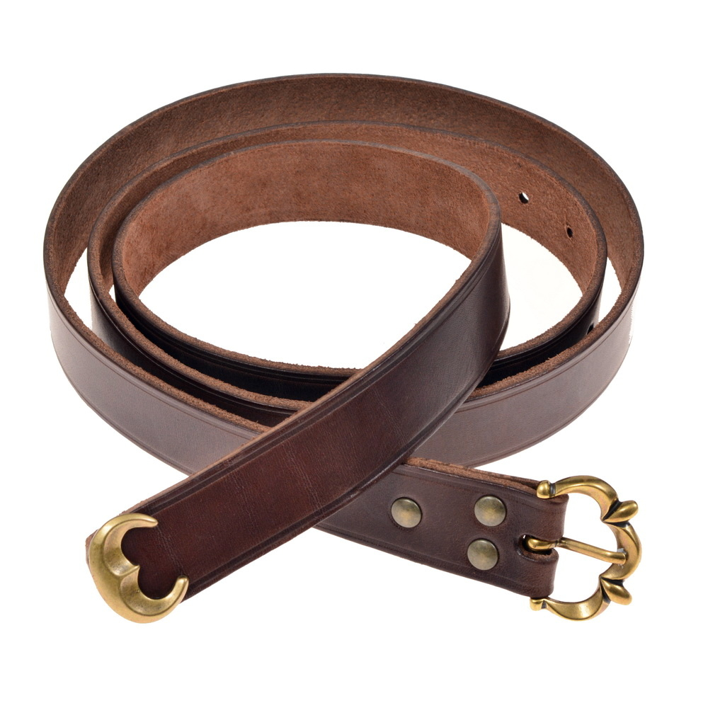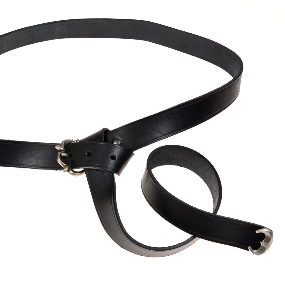 Dieser Hochmittelalter-Gürtel ist in schwarzem oder braunem Rindsleder mit wahlweise silber- oder messingfarbener Schnalle und Riemenzunge aus Zamakguss erhältlich.