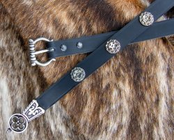 Dermittelalterliche Gürtel ist in schwarzem Leder mit silberfarbener Schnalle oder in braunem Leder mit messingfarbener Schnalle und Beschlägen erhältlich.