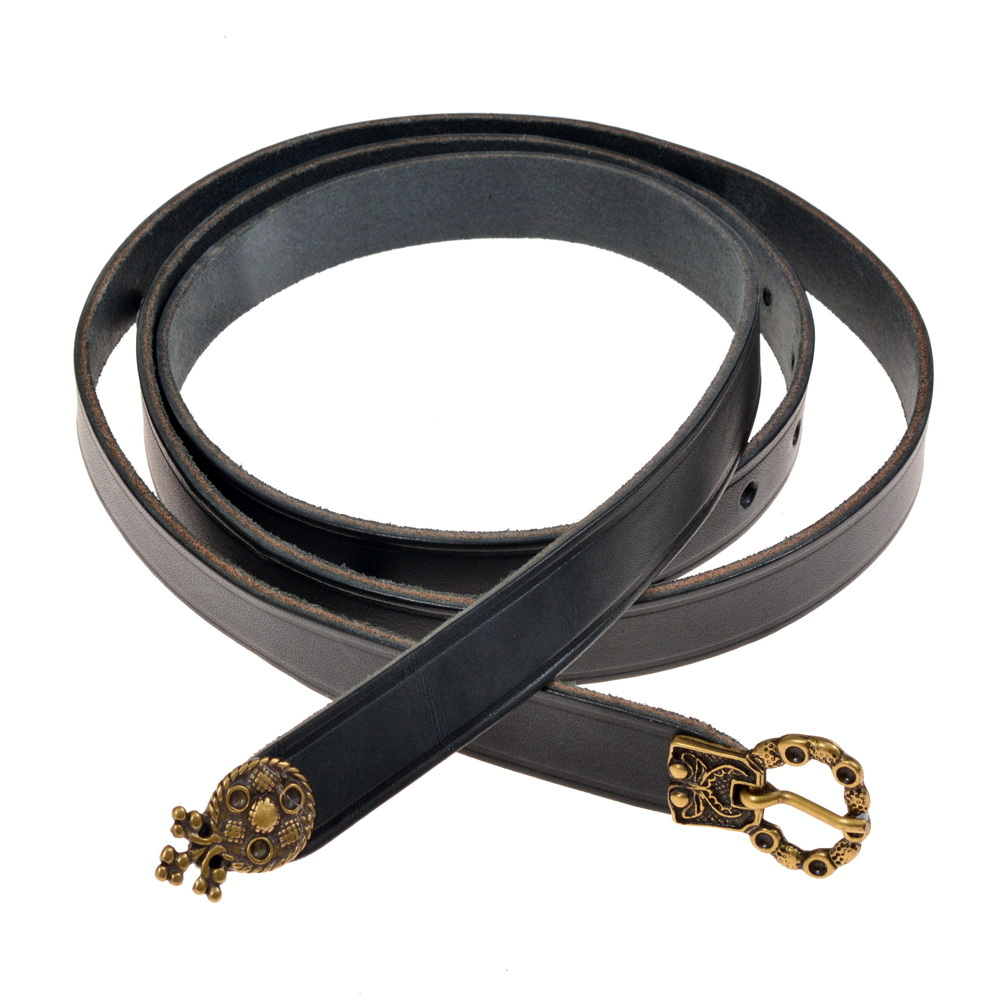 Der mittelalterliche Gürtel ist erhältlich in schwarzem oder in braunem Leder und wahlweise mit silber- oder messingfarbener Schließe und Riemenzunge aus Zamak.