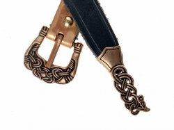 Ledergürtel der Wikingerzeit in 3 cm Breite mit Bronzeschnalle im Oseberg-Stil nach einem Fund von Gotland. Schwarz oder Braun. 160 oder 175 cm.