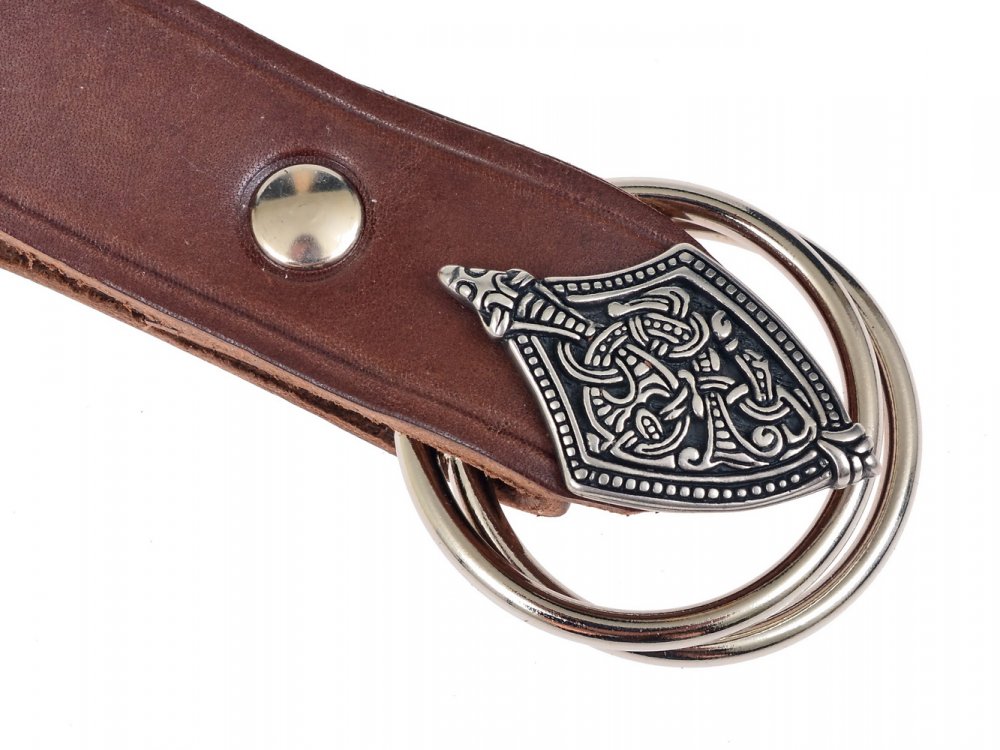 Als besonderer Blickfang prangt auf dem Lederriemen ein dekorativer Zier-Beschlag im Stil der Wikingerzeit.