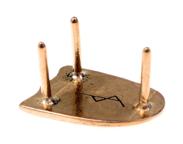 Befestigung: Auf der Rückseite des wikingerzeitlichen Riemen-Endbeschlags befinden sich drei Stifte. Zur Befestigung werden diese einfach durch entsprechende Löcher im Leder geführt. Mit einer Zange biegt man am besten die Spitze des Stifts ein wenig nach Innen. Klopft man dann mit einem Hammer die Stifte flach, so versenkt sich die Spitze dabei im Leder und der Riemenbeschlag wird stabil und plan befestigt.