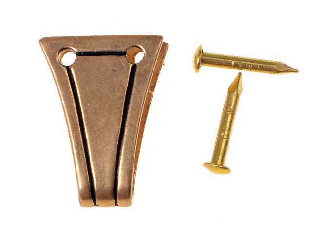 Um den Beschlag an der Saxscheide zu befestigen, liegen zwei Messingstifte bei. Zur Monatge werden diese durch zwei Löcher im Leder gesteckt und etwa 1 mm über dem Beschlag mit einem Seitenschneider eingekürzt.