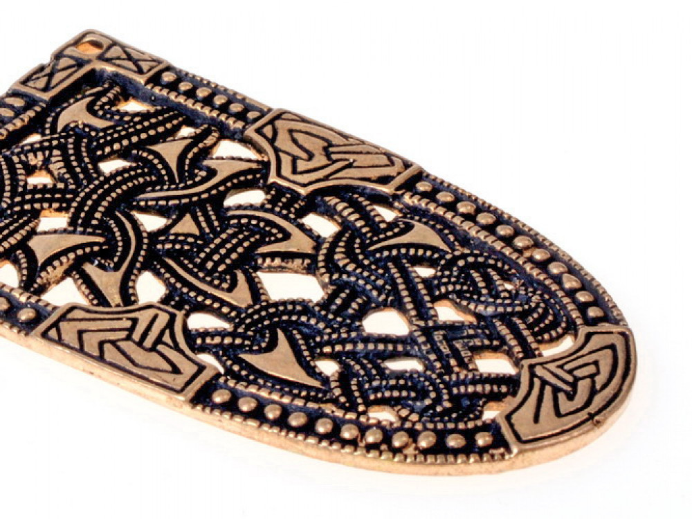 Die detailgetreue Replik eines Wikinger-Gürtelendes ist nach dem Vorbild einer Riemenzunge aus dem Schiffsgrab von Gokstad in Norwegen gearbeitet. Link zur Fund von Gokstad...