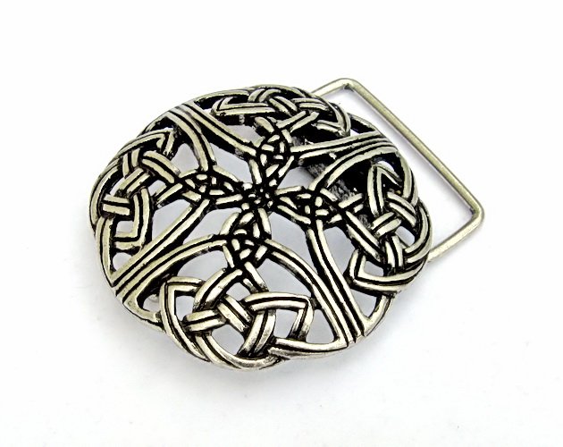 Die ausdrucksvolle Schnalle mit keltischen Knoten hat einen kleinen Dorn, der einfach in die Gürtel-Löcher eingehakt wird.