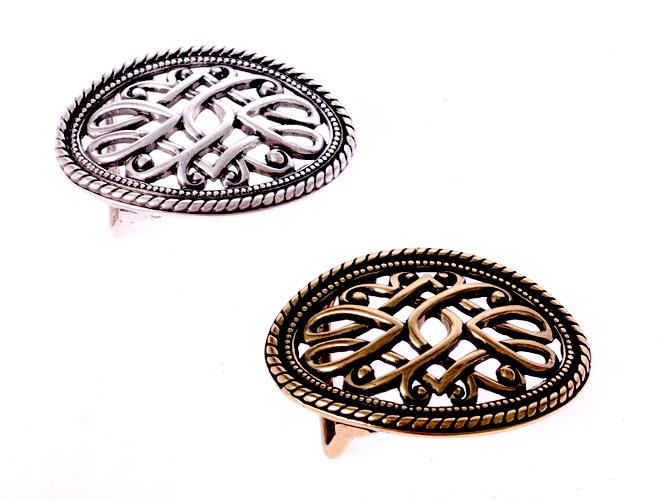 Der Buckle mit dem elegant durchbrochenen Knotenwerk ist in messing- oder silberfarben erhältlich. Zamakguss.