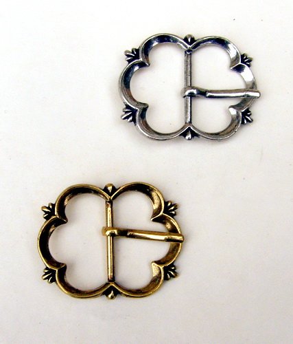 Erhältlich ist die mittelalterliche Schnalle in messing- oder silberfarben, gefertigt aus Zamakguss.