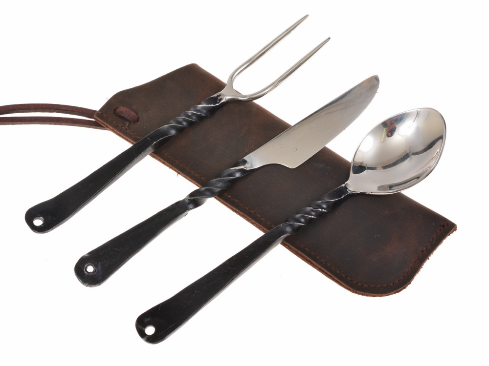 Das Mittelalter-Besteck besteht aus einem geschmiedeten Messer, einer zweizinkigen Gabel und einem formschönen Löffel sowie dem Besteck-Etui aus hochwertigem Rindsleder.