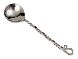 Passend zu diesem geschmiedeten Mittelalter-Esslöffel ist auch ein dreiteiliges Mittelalterbesteck erhältlich, bestehend aus Messer, Gabel und Löffel, die alle mit kunstfertig tordiertem Griff und mit elegant eingerollten Enden versehen sind und auch einzeln erworben werden können.