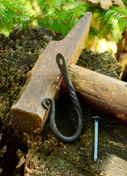 Das hübsch eingerollte Ende und die elegant eingedrehte Tordierung macht selbst so ein einfaches Gebrauchsgerät wie diesen geschmiedeten Wandhaken zu einem kleinen Schmuckstück.