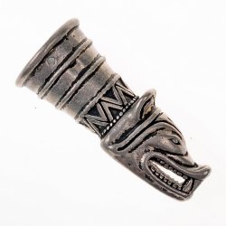 Replik einer Trinkhorn-Spitze der Wikingerzeit mit Rabenkopf nach einem Fund aus Norwegen. Bronze, versilbert oder 925 Silber. 10 x 2,5 cm.