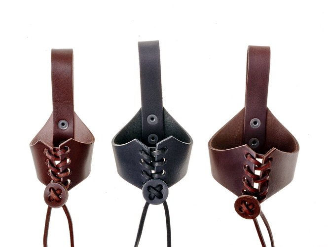 Erhältlich ist der Trinkhornhalter in drei verschiedenen Größen in schwarzem und braunem Leder. Halter, Lederband und Verschluss-scheibe werden einzeln geliefert.