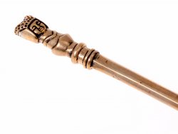 Das historische Vorbild, das für diese edle Messing-Gabel Pate stand, ist ein mittelalterlicher Löffel aus England mit der zierlichen Darstellung des Kopfes einer Dame am Stielende.