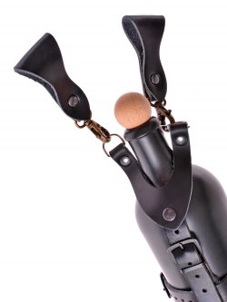 Das Leder-Halfter ist mit einem Riemen um die Schulter hängen ausgestattet und hat drei Schnallen, mit denen man die Trinkflasche aus dem Halfter nehmen sowie den Umfang regulieren kann.