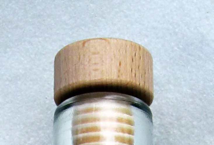 Als Verschluss für die Glas-Flasche dient ein kleiner Spitzkorken aus Naturkork oder ein gerillter Kunststoffkorken mit flachem Holzkopf