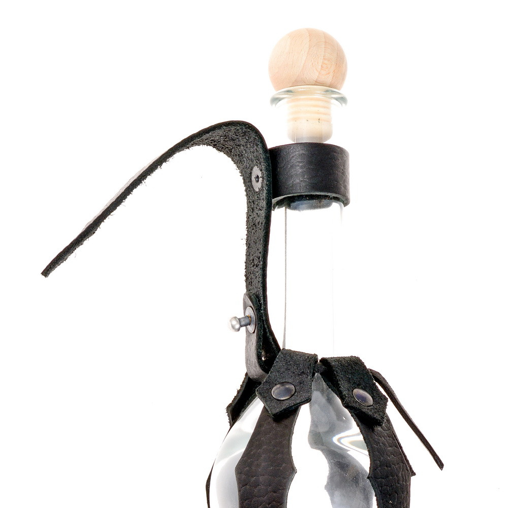Die Glas-Feldflasche wird komplett mit Lederhalterung geliefert.