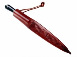 Ein besonderes Augenmerk verdient auch die schön gestaltete und hochwertig verarbeitete Lederscheide mit einem geprägten Motiv nach historischen Vorbildern aus dem späten Mittelalter.