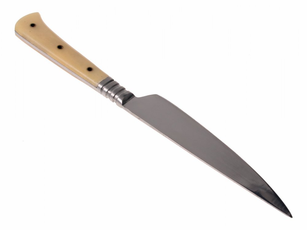 Der Griff aus Bein ist solide mit dem Messer vernietet und endet in einer aufwendig ausgearbeiteten Zwinge, die den Übergang zur Klinge dekorativ abhebt.