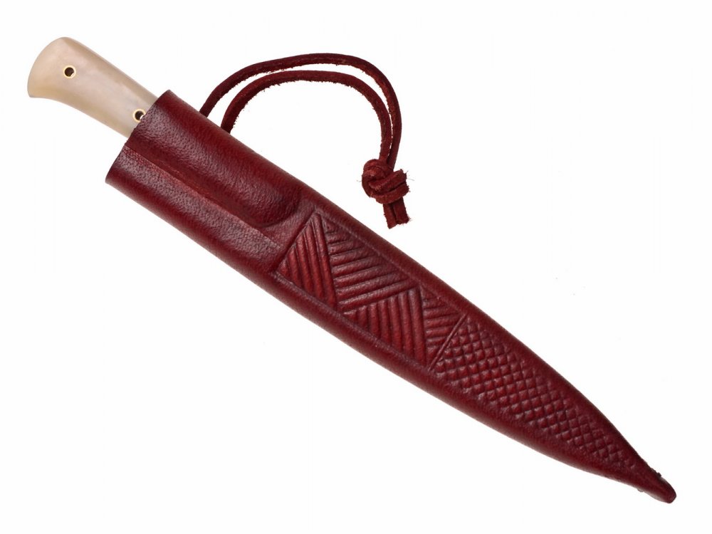 Mittelalterliches Alltagsmesser mit Beingriff für die authentische Darstellung im Spätmittelalter-Reenactment. Mit geprägter Lederscheide. 23 cm.