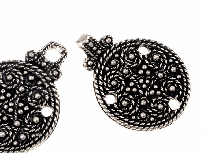 Dieser bemerkenswerte Gewandverschluss wurde nach dem Vorbild eines Wikinger-Anhängers in Granulationstechnik aus Grab BJ 943 in der Wikinger-Stadt Birka / Schweden gefertigt.