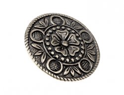Die große mittelalterliche Tasselscheibe ist erhältlich in messing- oder silberfarben aus Zamak-Guss gefertigt.