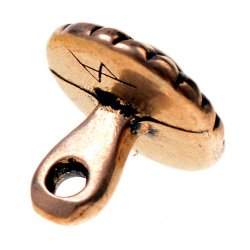 Mit der solide angegossenen Öse auf der Unterseite kann der mittelalterliche Knopf mit wenigen Stichen auf der Gewandung befestigt werden.