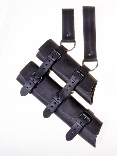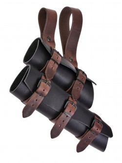 Erhältlich ist der mittelalterliche Doppel-Schwerthalter in schwarzem oder braunem Leder, wahlweise auch mit Riemen in umgekehrter Farbverteilung.