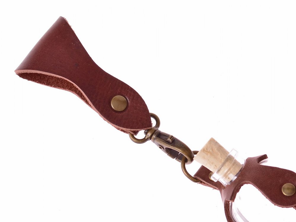 Die Trankflasche befindet sich in einem Leder-Korsett aus braunem oder schwarzem Leder , das mit einem kleinen Karabiner-Haken an den Gürtel-Halter aus Leder eingehängt wird. Optional bieten wir auch einen Halter mit zwei Trankflaschen an.
