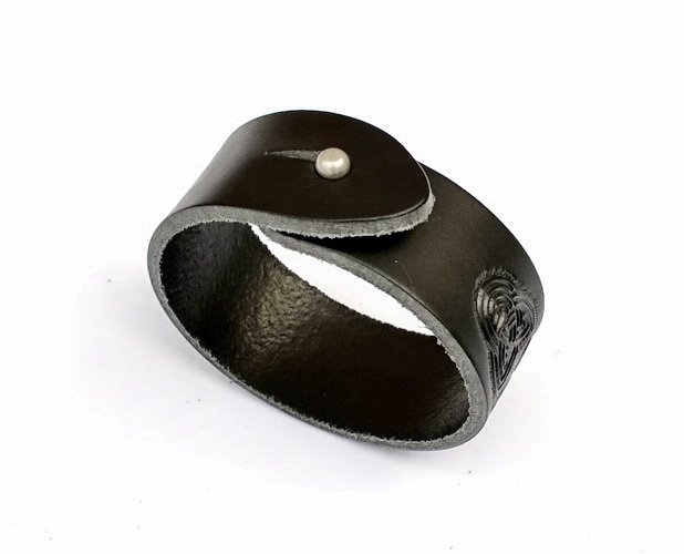 03 A-G 3 TR Markant geprägtes Armband mit Tribal-Motiv. 3 cm breit. Pflanzlich gegerbtes Leder, schwarz oder braun. S - XL.