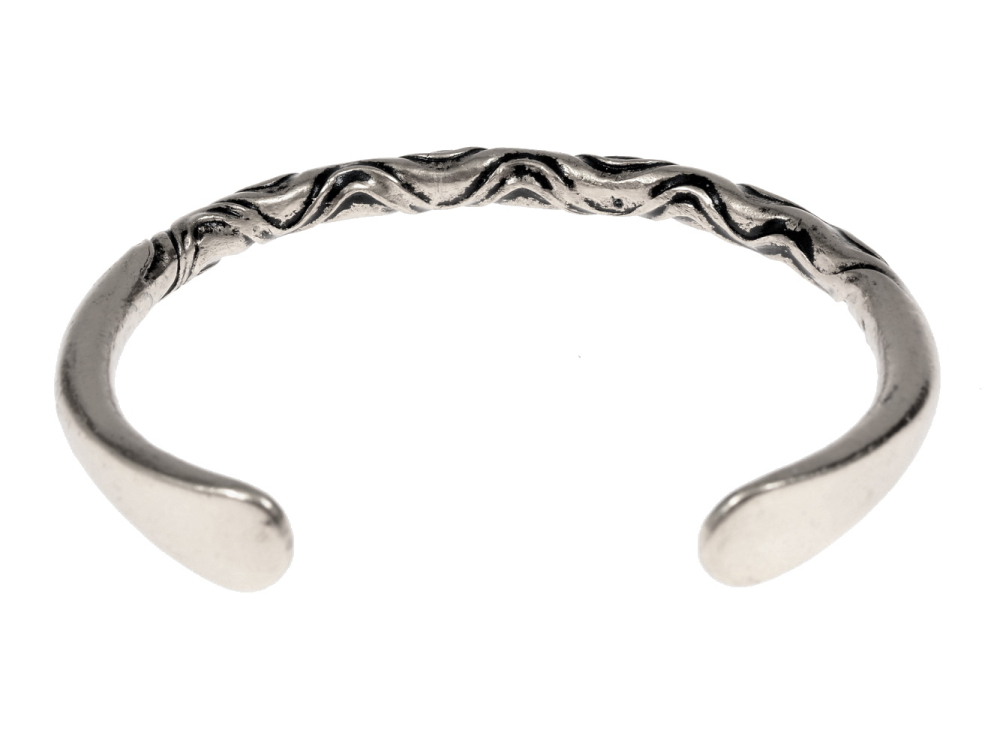Replik eines breiten Wikinger-Armrings für kräftige Handgelenke nach einem Fund aus dem Baltikum. Bronze, versilbert oder 925 Silber. Umfang 19 - 24 cm.