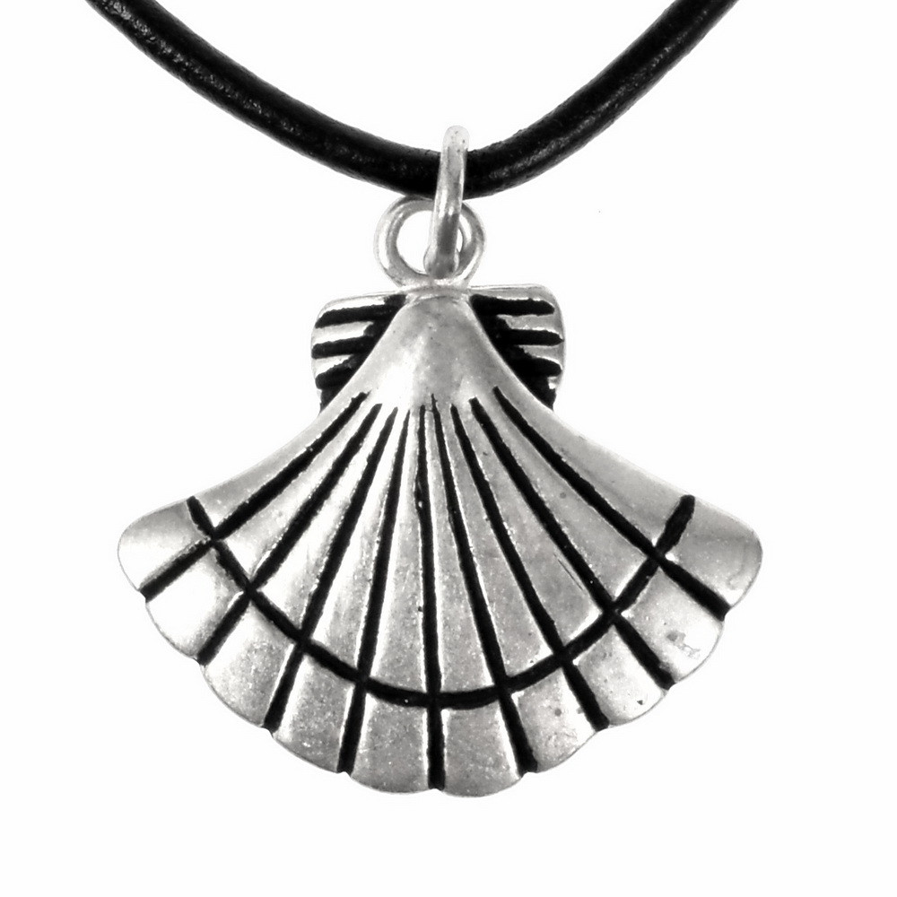 Ein schwarzes Lederband in 1 m Länge liegt dem Pilgermuschel-Anhänger bei.