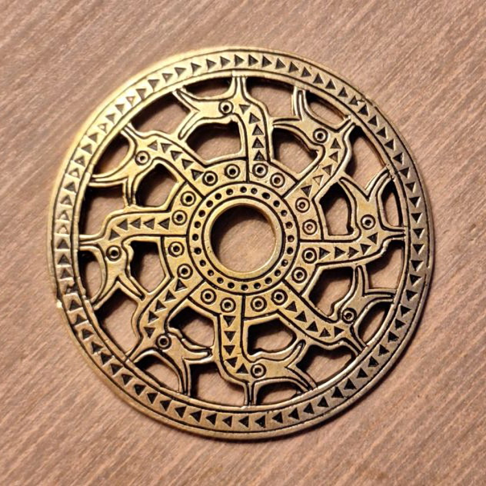 Das historische Vorbild für diesen germanischen Sonnenrad-Anhänger ist eine fränkische Zierscheibe der Merowingerzeit aus der Ausstellung des Römisch-Germanischen Museums in Köln, die auf das späte 6. oder frühe 7. nachchristliche Jahrhundert datiert.