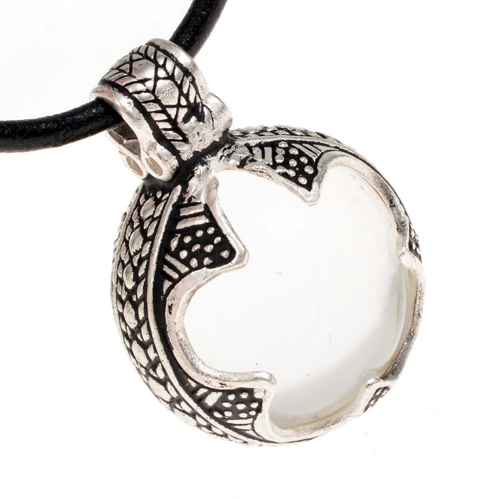 Ein schwarzes Lederband in 1 m Länge liegt der Bergkristall-Perle bei.