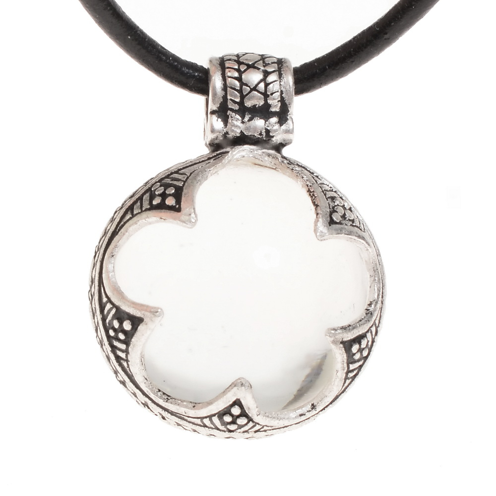Ein schwarzes Lederband in 1 m Länge liegt der Bergkristall-Perle bei.