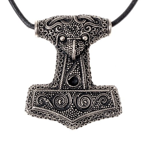 Der detailreich in filigraner Granulationstechnik gearbeitete Thorshammer ist nach einen schwedischen Mjölnir gearbeitet, der nach dem Fundort auch Schonenhammer genannt wird und auf die späte Wikingerzeit datiert.