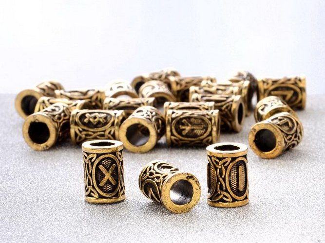 Erhältlich ist die Runen-Perle in messingfarben und silberfarben, gefertigt aus Zamakguss. Hier finden Sie weitere Bartperlen...