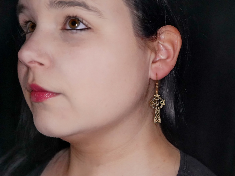 Diese Ohrringe mit einem keltische Kreuz sind ein ausdrucksvoller Ohrschmuck und schönes Accessoire für die historische Gewandung in der mittelalterlichen Darstellung.