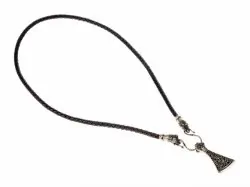 Die 5 mm starke Wikingerkette aus geflochtenem Leder hat ausdrucksvolle Endkappen in Form von Drachenköpfen die ein wikingerzeitliches Axt-Amulett in ihren Mäulern halten.