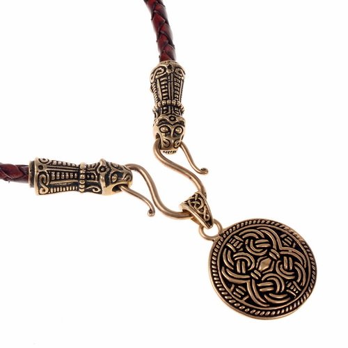 Die 4 mm starke Wikingerkette aus geflochtenem Leder hat schöne ausdrucksvolle in Form von Tierköpfen die einen wikingerzeitlichen Anhänger in ihren Mäulern halten.