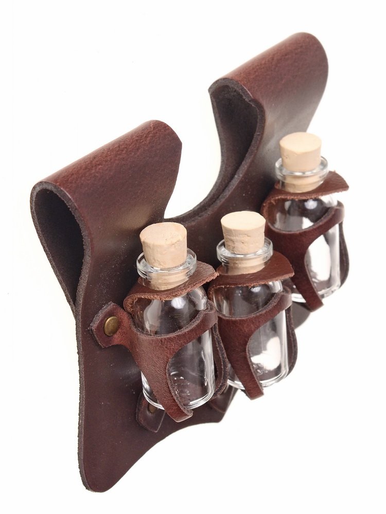 The potion bottles are clearly visible in a small holder directly on the leather, so that different coloured potions can be displayed to their best advantage.