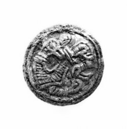 08 Wi-0 Cherni Small fitting of the Rus after a Viking Era finding from Chernigov / Ukrain. Zamak in silver or brass color. 1.7 x 1.4 cm.