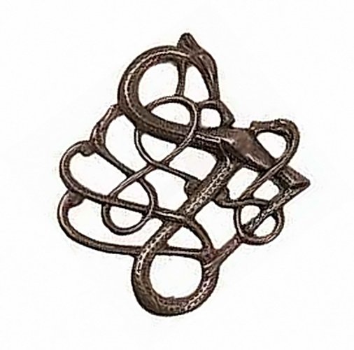 The Trollaskogur brooch shows a large animal with a curved neck and clearly recognisable front feet, whose body ends in two tails. There are also two snakes coiled around the animal's neck and feet.