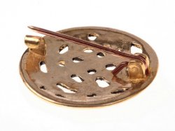 solid pin of about 1 mm thickness on the back, which is used to fasten the brooch to the garment, preferably to close the shirt neckline.