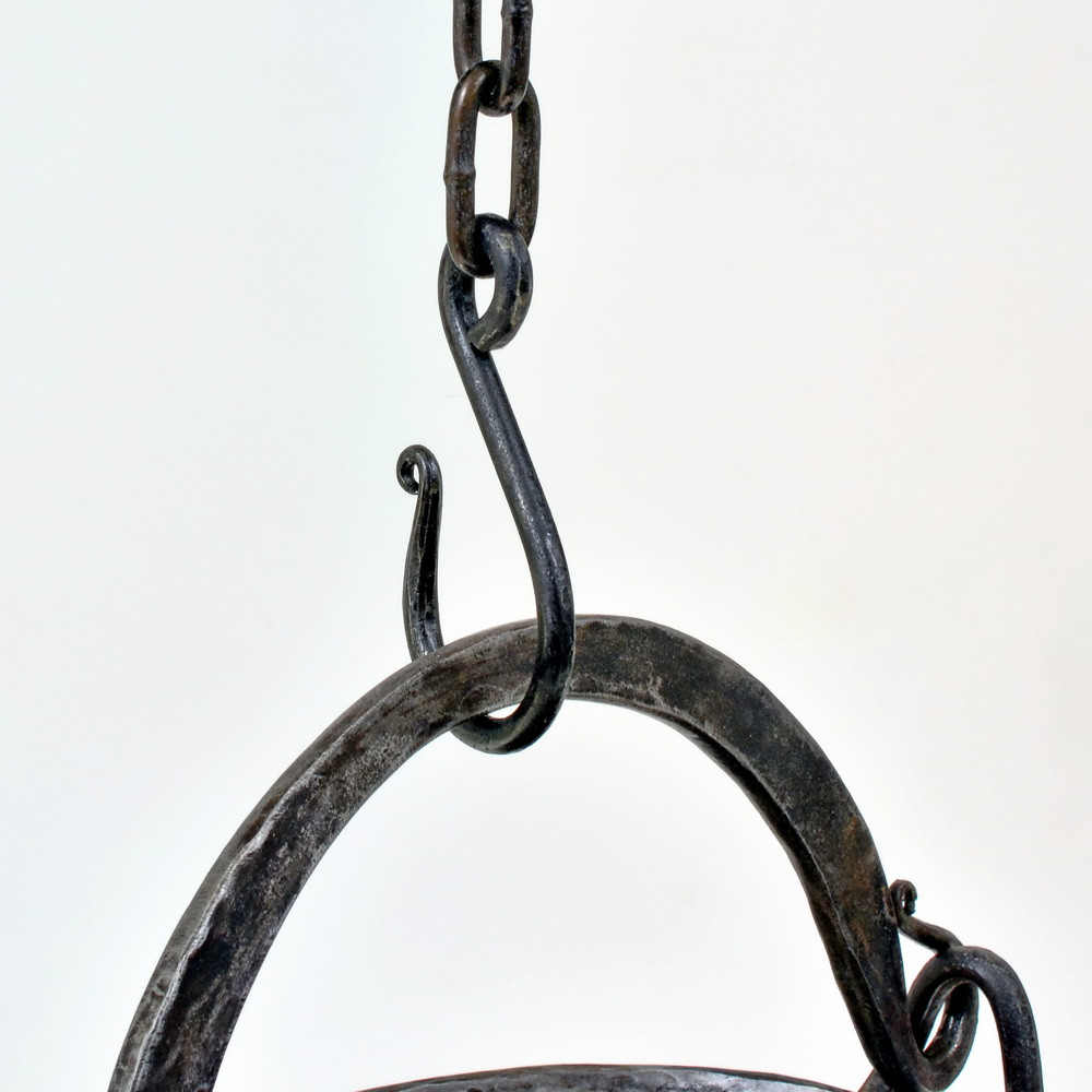 The medieval trammel chain has a small hook on one side which is simply hooked into the cauldron handle or into a link of the chain so that the height of the cauldron above the fire can be easily adjusted.