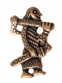 The warrior pendant of Klahammar shows a striding Viking warrior with long hair, dressed in a chain mail, with a sword in the right hand and a long beard axe in the left.