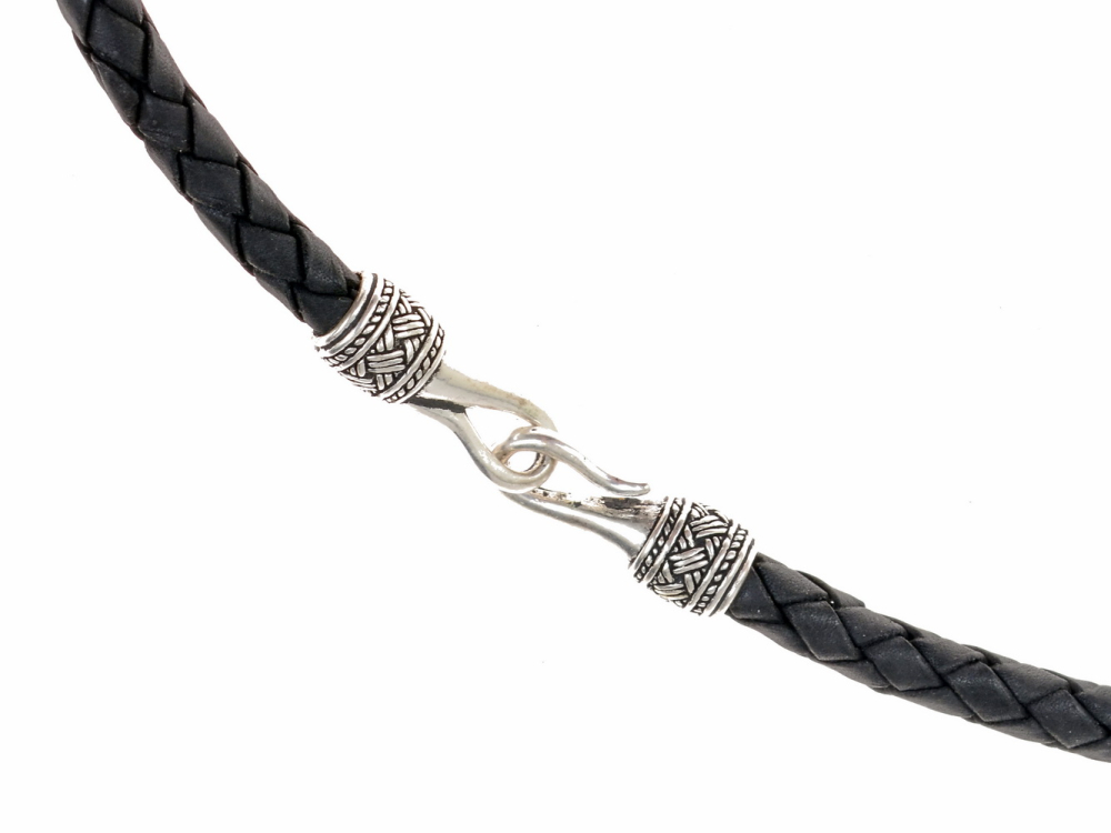 The braided leather cord is available in an elegant matte black color with silver plated end caps or in a nice antique brown with bronze heads.