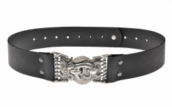 5 cm wide leather belt with eye-catching hook closure in the style of the Pitney Brooch. Black or brown leather with medieval embossing. S + L.