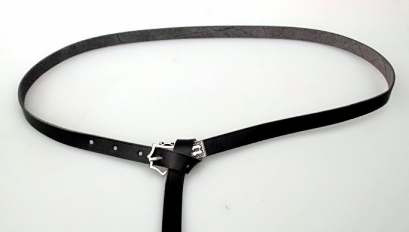 The 1.5 cm narrow medieval belt is made of high-quality cowhide 2.5 to 3 mm thick in black or brown and is available with a brass or silver-coloured buckle and strap end.
